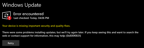 After getting stuck in the installation process, Windows Update generates the 0x800f0831 error with a matching failure to install message.