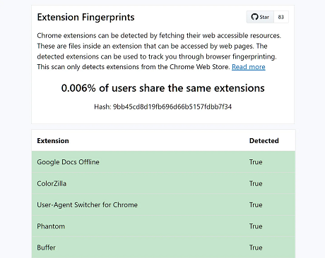 Based on the combination of installed extensions, the website will generate a tracking hash that can be used to track that particular browser, as shown below.