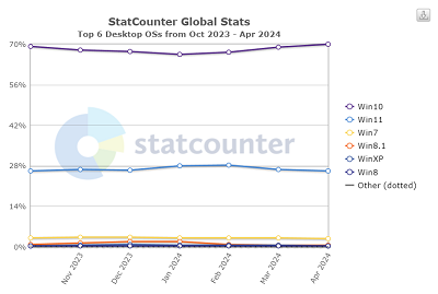 The increase recorded in April 2024 was roughly 1%, Statcounter shows. During the same time frame, Windows 11's market share dipped slightly to 25.69%, suggesting the increase in people using Windows 10 came at the expense of its successor. That's a serious blow for Microsoft.