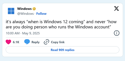 But according to one Microsoft employee manning the official Windows account on X, one question looms larger than most, humorously posting earlier this week: "It's always 'when is Windows 12 coming' and never 'how are you doing person who runs the Windows account."