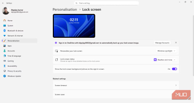 The lock screen also includes its own form of promotion. With Windows Spotlight enabled, it displays rotating backgrounds along with tips and suggestions, sometimes including prompts related to Microsoft services such as Edge or OneDrive. Switching to a static picture removes those Spotlight messages.