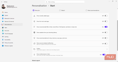 The first place I checked was the Start menu because subtle promotions can appear there. It shows your own shortcuts alongside a Recommended area, which can include Microsoft suggestions that aren't based on what you use. Over time, these suggestions make the menu feel cluttered instead of personal.