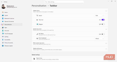 The last area I checked was the taskbar, where Windows shows Widgets and Search content that can include promotions or trending items. The news feed inside Widgets can surface sponsored cards and app recommendations. You can turn these off with a couple of settings to keep the desktop cleaner.