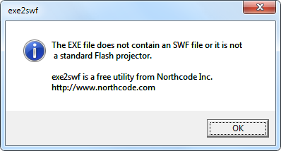 You can pass the EXE name as a command line parameter to exe2swf or you can simple launch the application and use the Windows File Open dialog to locate the EXE you want to convert. If an SWF file can’t be found in the EXE you provide, exe2swf will tell you. If an SWF file is found it will be extracted to the same directory where the EXE file is located.